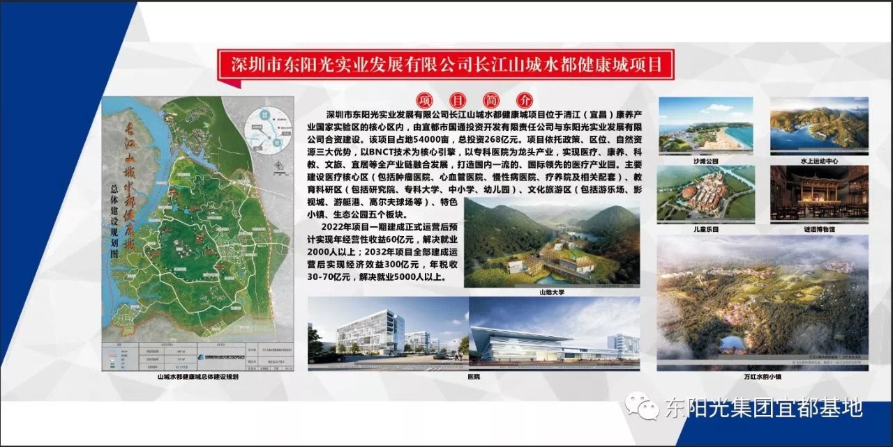 “長江山城水都健康城”項目總投資268億元,規(guī)劃用地5萬余畝,由宜都市國通投資開發(fā)有限責任公司與東陽光公司共同開發(fā),以BNCT技術(硼中子俘獲療法)為核心引擎,建設國內(nèi)最大的抗腫瘤治療中心,打造國內(nèi)一流、國際領先的康養(yǎng)產(chǎn)業(yè)集群。