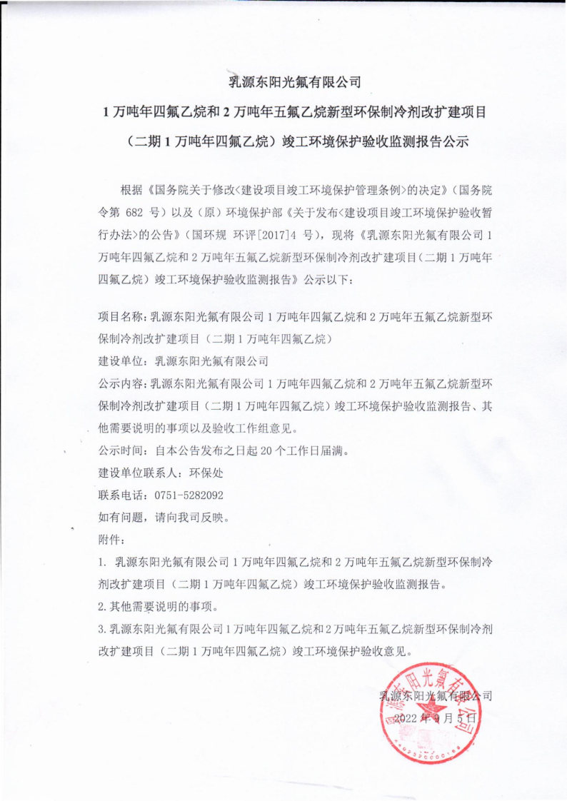乳源東陽光氟有限公司1萬噸年四氟乙烷和2萬噸年五氟乙烷新型環(huán)保制冷劑改擴建項目(二期1萬噸年四氟乙烷)竣工驗收公示