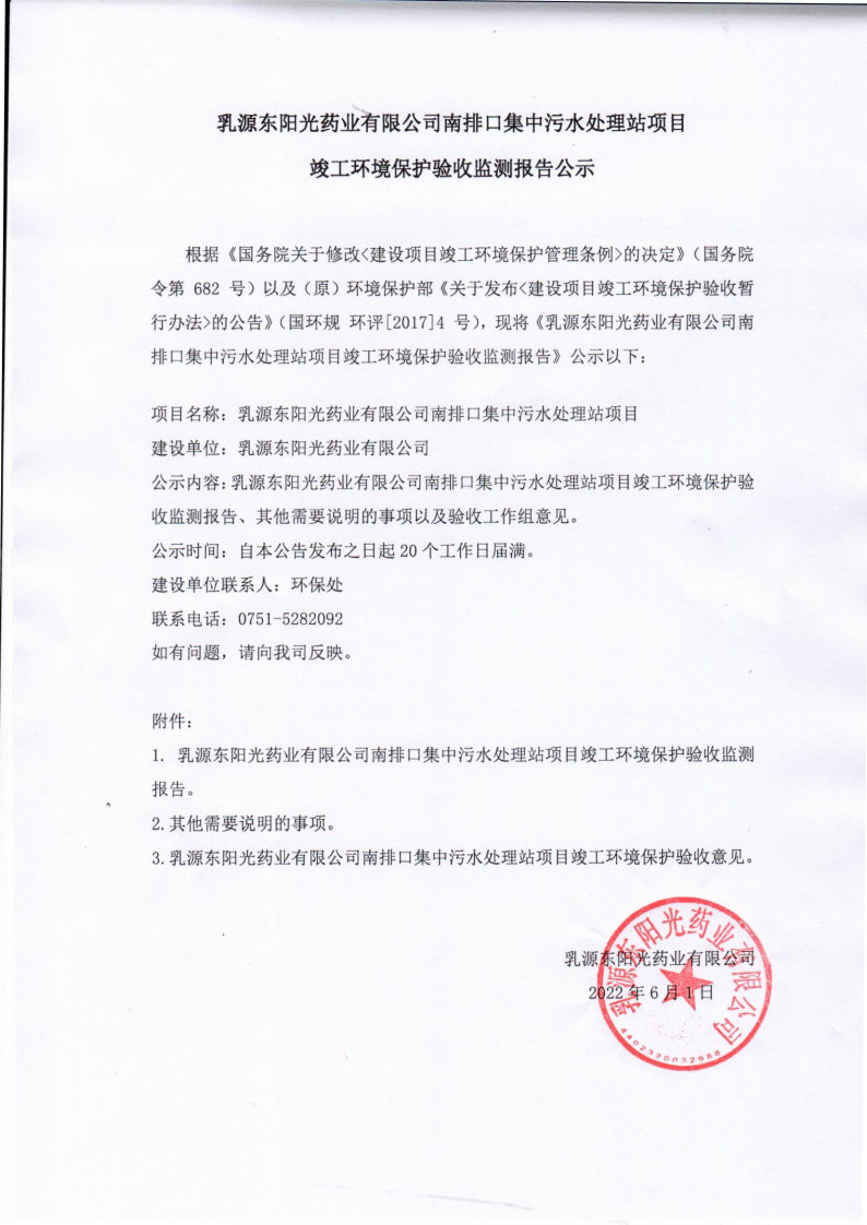 乳源東陽光藥業(yè)有限公司南排口集中污水處理站項目竣工環(huán)境保護驗收監(jiān)測公示