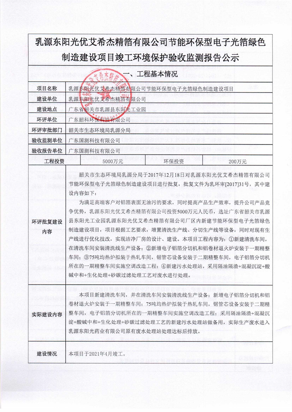 乳源東陽光優(yōu)艾希杰精箔有限公司節(jié)能環(huán)保型電子光箔綠色制造建設項目竣工環(huán)保驗收公示
