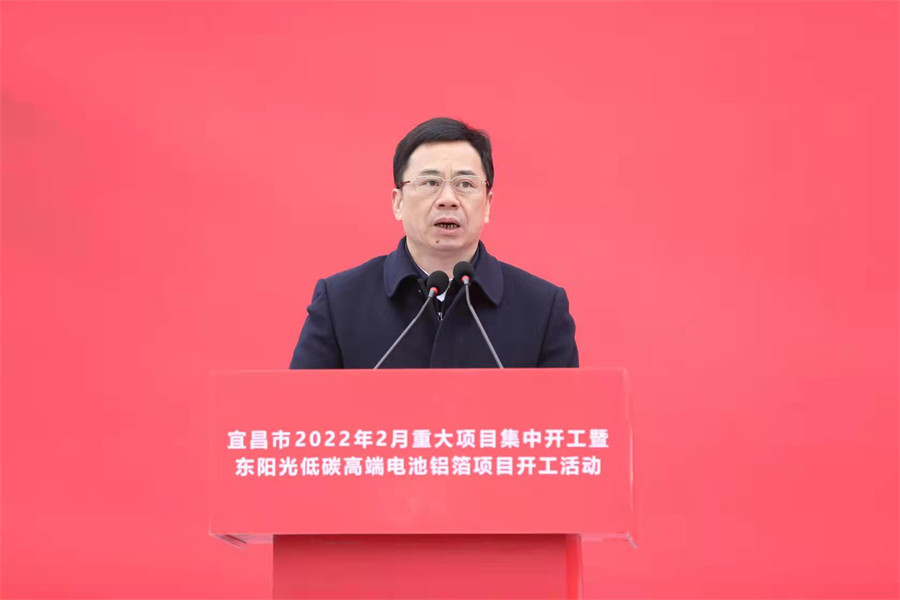 2月8日,2022年一季度湖北省重大項目集中開工宜昌分會場活動&mdash;&mdash;宜昌市2022年2月重大項目集中開工暨東陽光低碳高端電池鋁箔項目開工活動在電池箔項目建設現(xiàn)場隆重舉行。湖北省副省長、宜昌市委書記王立宣布項目開工,宜昌市委副書記、市長馬澤江主持活動,宜昌市副市長、宜都市委書記譚建國參加活動并致辭,集團董事長張寓帥作項目介紹。